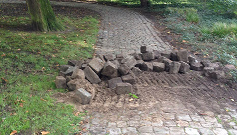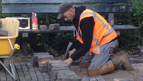 In opdracht van de Gebroeders Oomen uit Sprundel herstellen wij de bestaande wandelpaden in het Emile Van Loonpark in de gemeente Roosendaal. Onze werkzaamheden omvatten; het opbreken en afvoeren van de bestaande natuursteenkeien en gebakken waal –en dikformaten, het aanbrengen van opsluitbanden, aanbrengen van een molgoot van gebakken dikformaten en het dichtstraten van de wandelpaden met gebruikte gebakken dikformaten. Verder vallen onder deze opdracht het aanbrengen en opbreken van de bestaande straatkolken inclusief de bijbehorende kolkleidingen. De Gebroeders Oomen heeft ons de opdracht gegund omdat ons bedrijf gespecialiseerd is in het zgn “onder de hamer” aanbrengen van oud bestratingsmateriaal.